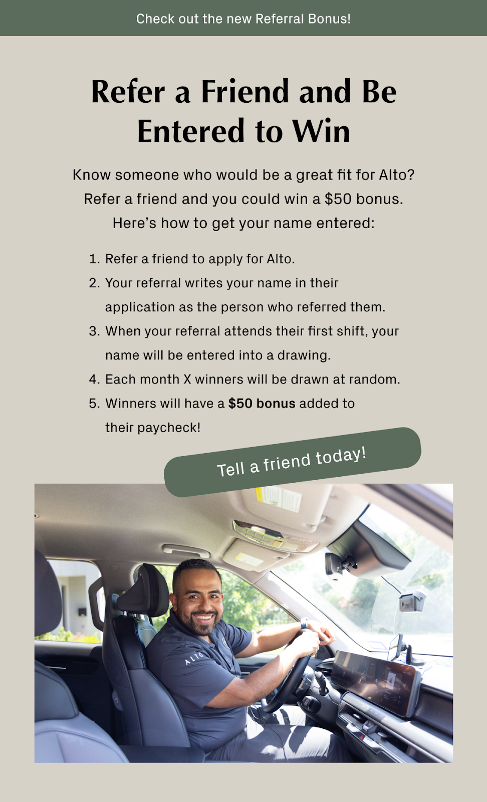 Refer a friend to apply with Alto in Uber markets and you could be entered to win a $50 bonus. For every referral that completes their first shift, the driver who referred them will be entered into a monthly drawing. Each month, three winners are selected at random and receive a $50 bonus added to their paycheck.